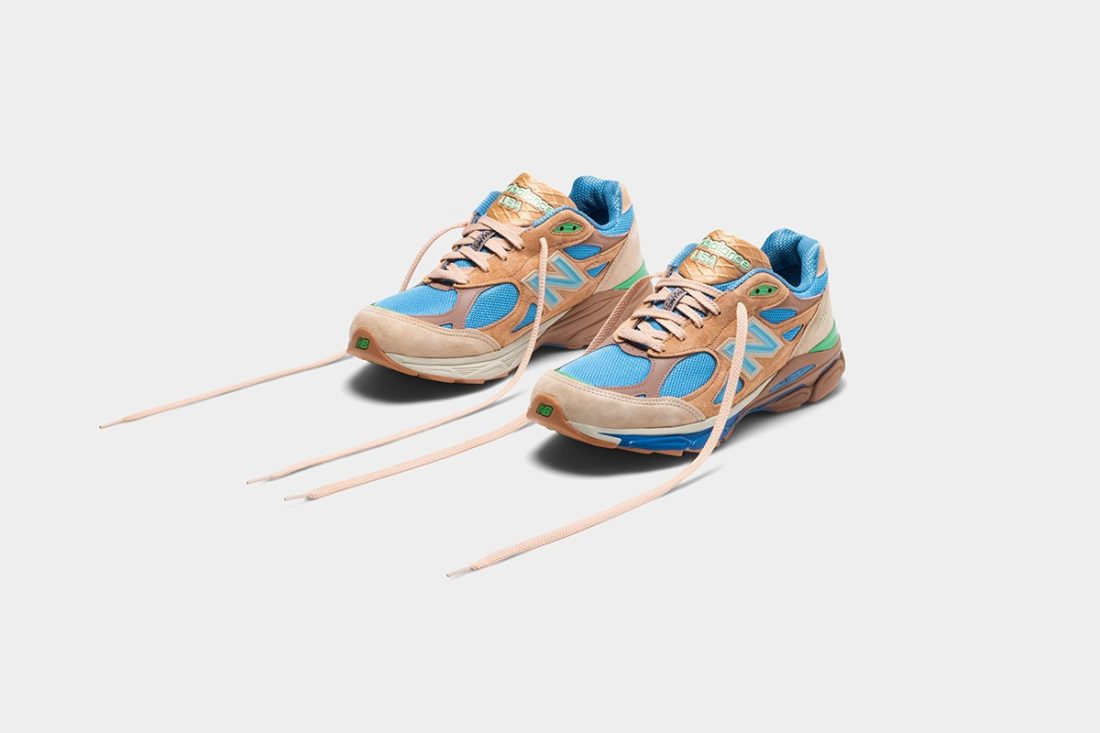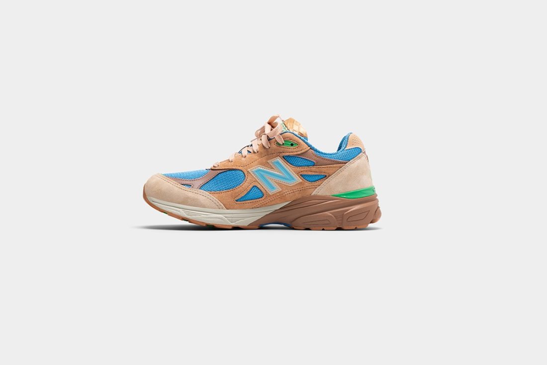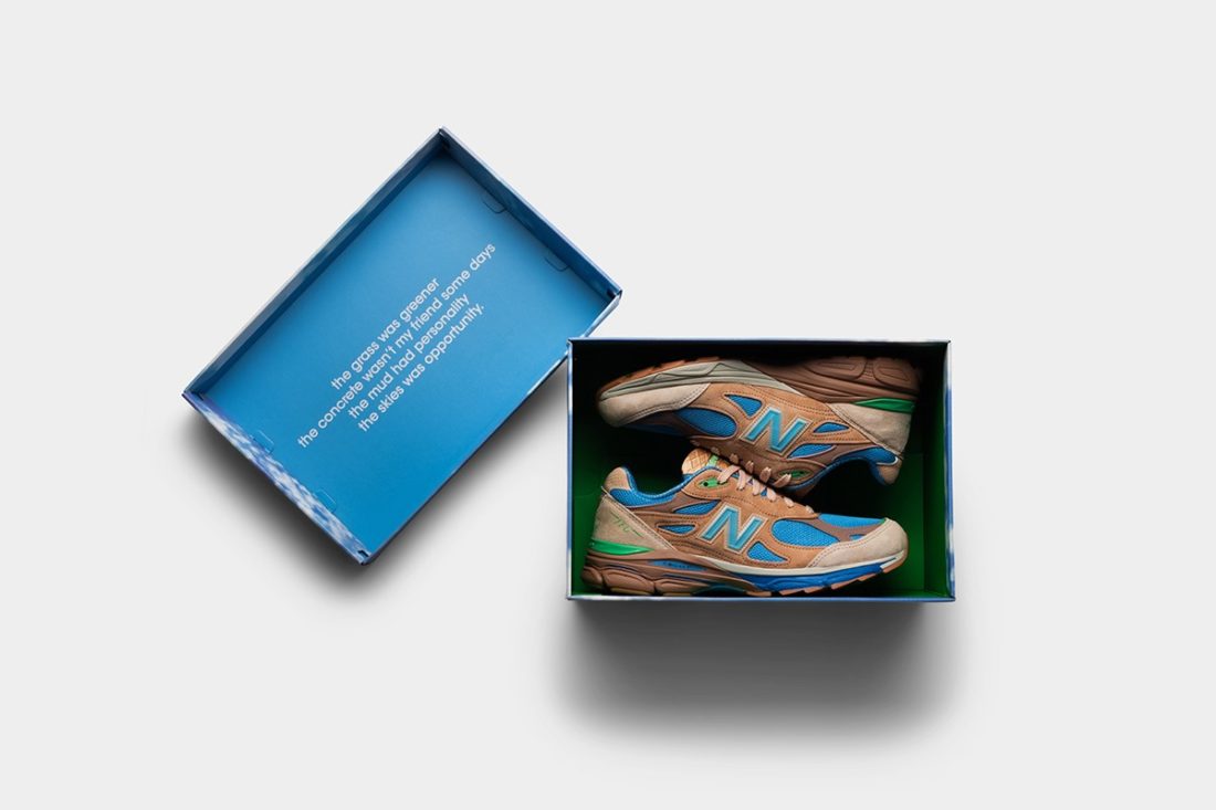 Der NB 990 V3 “Outdoor Clothes” verwendet blaues Mesh und braunes Veloursleder für das Obermaterial um Erde und Himmel repräsentiert. Für die weicheren Brauntöne auf dem Mudguard und der Ferse wurde hochwertiges Wildleder genutzt. Auf der Ferse könnt Ihr das kollaborative Branding entdecken. Grüne Akzente wie z.B. auf der Sohle und der Ferse imitieren auf dezente Art eine grasgrüne Wiese.