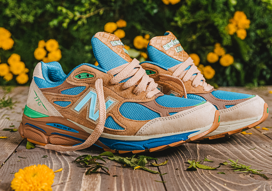 Der NB 990 V3 “Outdoor Clothes” verwendet blaues Mesh und braunes Veloursleder für das Obermaterial um Erde und Himmel repräsentiert. Für die weicheren Brauntöne auf dem Mudguard und der Ferse wurde hochwertiges Wildleder genutzt. Auf der Ferse könnt Ihr das kollaborative Branding entdecken. Grüne Akzente wie z.B. auf der Sohle und der Ferse imitieren auf dezente Art eine grasgrüne Wiese.