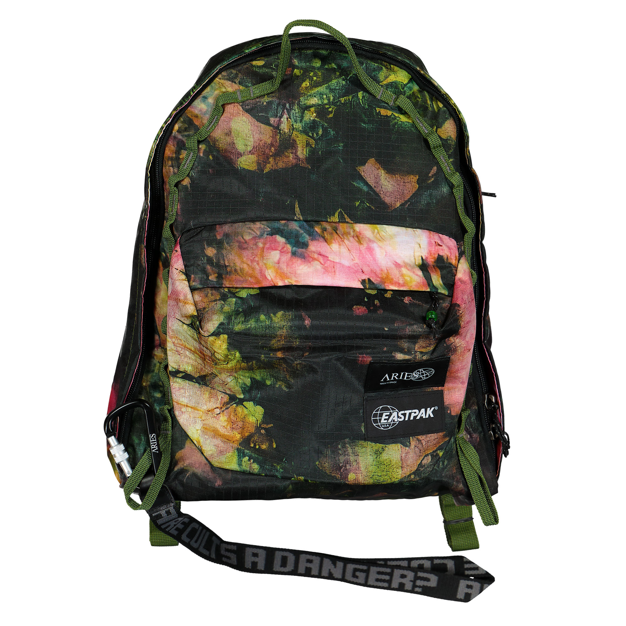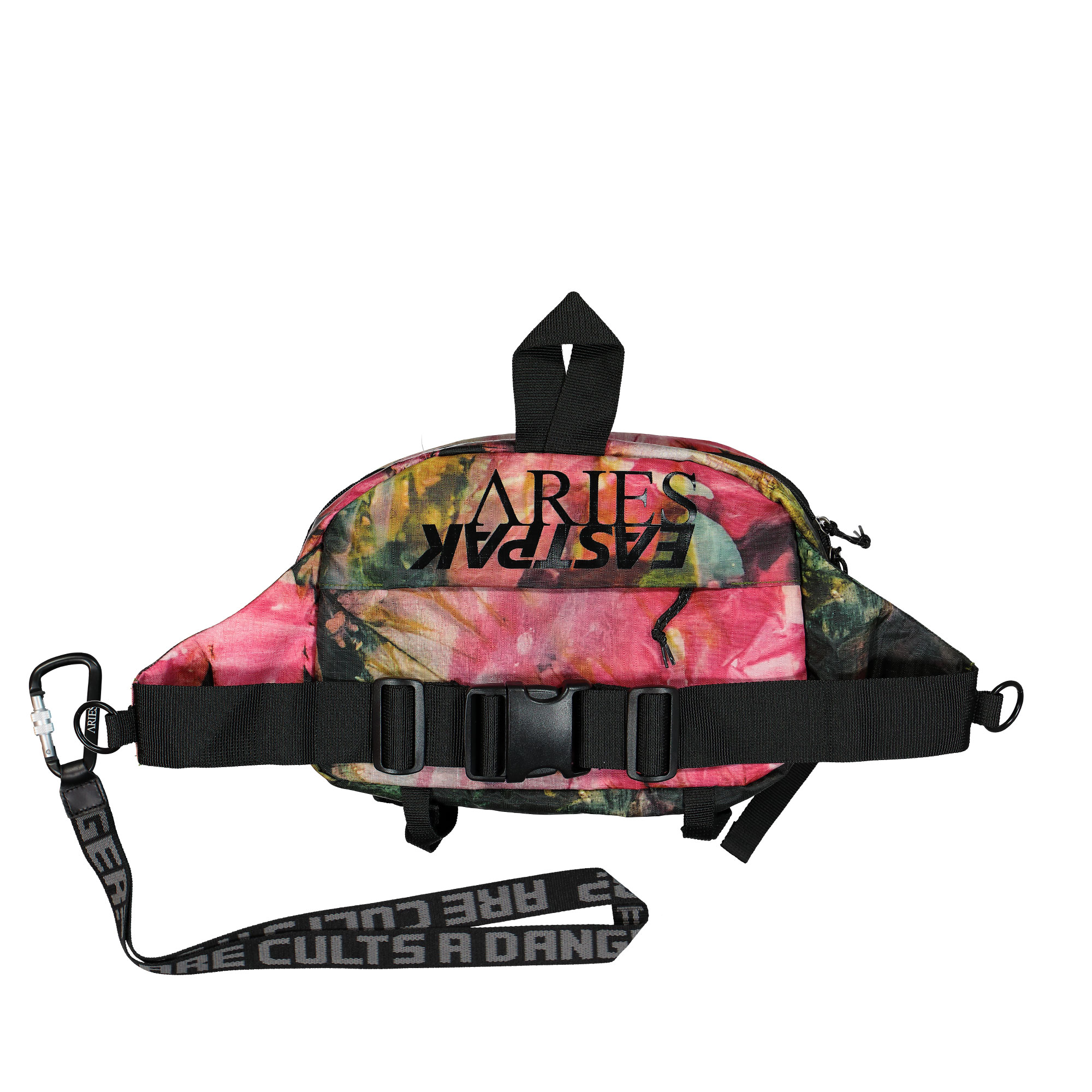Optisch hat sich Aries verwirklich, indem gebatikte Camo-Optik mit frühlingshaften rosa Blüten gepaart und mit schwarzem Elementen versehen wurden. Die aus Mesh, Nylon, sowie Ripstop gemachten Taschen wurden mit typischen Military Strapping oder Accessoiry Loops versehen. Letztgenannte erinnern optisch an Steckplätze für Patronen, die man von Munitionsgürteln aus Kriegsfilmen kennt und mit denen man definitiv einen Hingucker geschaffen hat….und sei es nur, weil sich der Passant beim flüchtige Blick im Vorbeigehen nicht sicher war, ob sich dort am Gurt der Tasche gerade tatsächlich Patronenhalterungen befunden haben und er deswegen dem Träger der Tasche einen zweiten, verwirrten Blick hinterher wirft. Ein nices Add On bei allen fünf bei uns erhältlichen Bags ist das abnehmbare Kollabo-Schlüsselband aus Jacquard, auf dem in Großbuchstaben der Spruch “ARE CULTS A DANGER“ geschrieben steht und das einen Karabinerhaken als Abschluss besitzt.