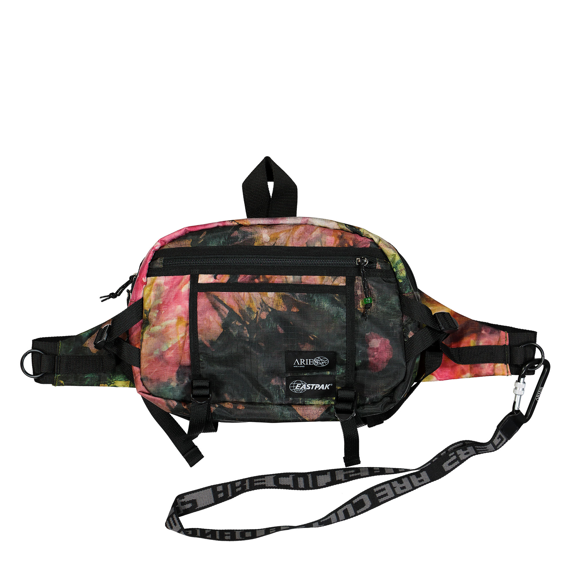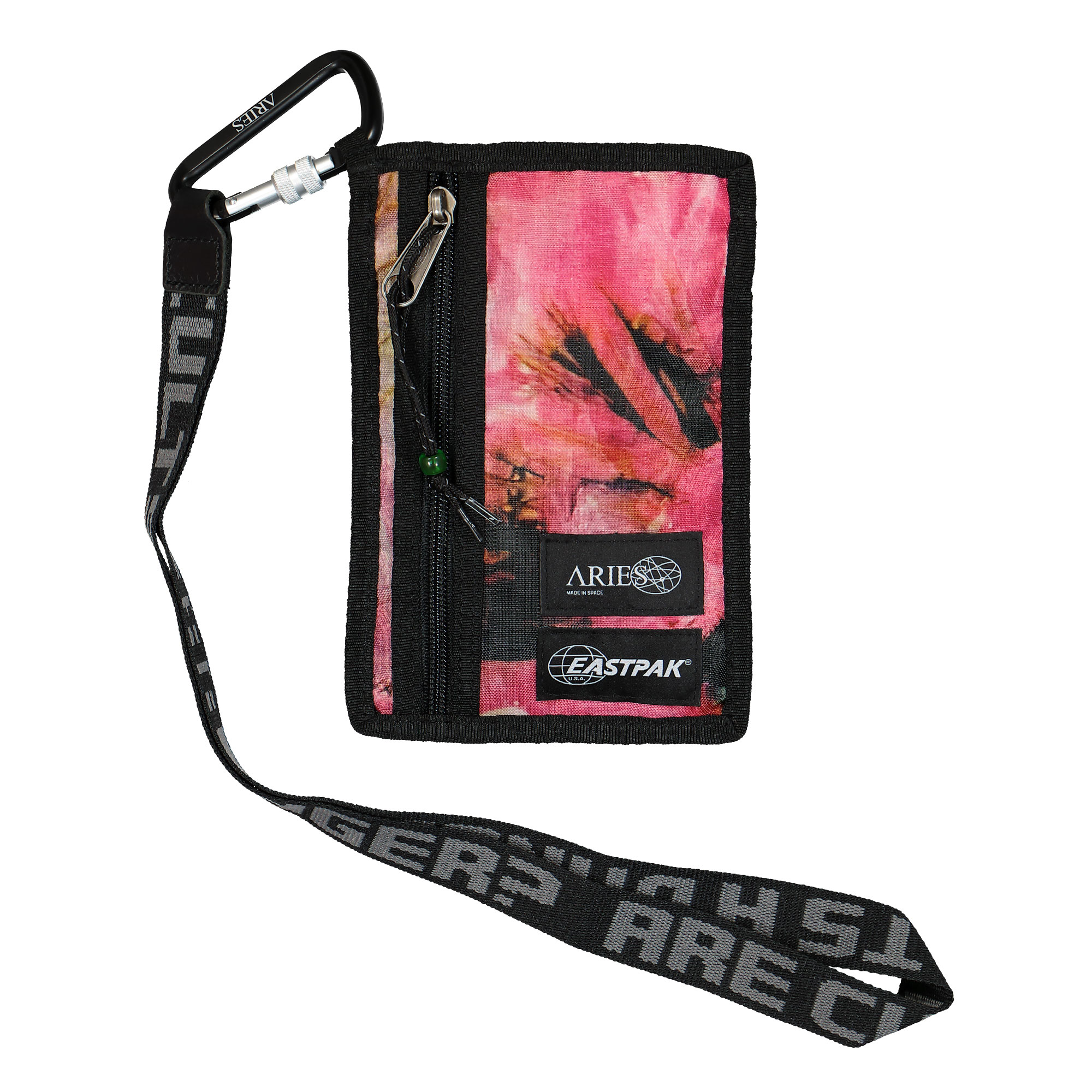 Eine der wohl bekanntesten Taschen weltweit ist der EASTPAK Padded Rucksack, den vermutlich jeder von uns zu irgendeinem Zeitpunkt seines Schullebens einmal in Besitz hatte. Der “Padded“ ist mit einem neuen “Skin“ aus 400D strukturierten Ripstop Material ausgestattet. Das Hauptfach des Rucksacks ist mit einem extra langen Reißverschluss versehen, das vorne aufsitzende Fach wurde vergrößert und mit Logo Patches beider Brands versehen. Das vielleicht ausgefallenste Teil der Kollektion ist die “Vest“, welche die absolute “Street Ready“ Mentalität der beiden Marken widerspiegelt. Auf dem schwarzen Nylon-Grundgerüst der Weste sitzen mehrere wasserfeste und zum Teil mit Reißverschlüssen versehene Brust- und Seitentaschen, die in der oben bereits erwähnten gebatikten Camo-Optik kommen. Auch hier sind Logo Patches beider Brands gut sichtbar platziert. Diverse Straps, sowie Gear Loops und Military Hooks komplettieren den Look. Die Dokumententasche “Cullen“ ist mit dem selben wasserfesten Ripstop ausgestattet, wie der Rest der Kollektion, so dass Papiere, die darin transportiert werden können, trocken bleiben. Farblich haben wir hier einen Mix aus Schwarz auf der einen, und Blütenrosa auf der anderen Seite. Mit einem fetten Aries/EASTPAK Lettering ist die “Bum Bag“ versehen. Sie kann legere um die Hüfte getragen werden, so wie es in den 90er Jahren Standard war, oder “modern“ überkreuz über eine Schulter. Auch hier sehen wir diversen Military Gear Loops und Tactical Design Features. Zu guter letzt möchten wir euch noch die “Talky“ Bag vorstellen. Sie ist die perfekte Mischung aus Dokumententasche und Hip Bag, wie die Hüfttaschen früher genannt wurden. In schönem Camo Muster gehalten, ist sie recht dünn – gut geeignet für Smartphone und andere kleinere Gegenstände.